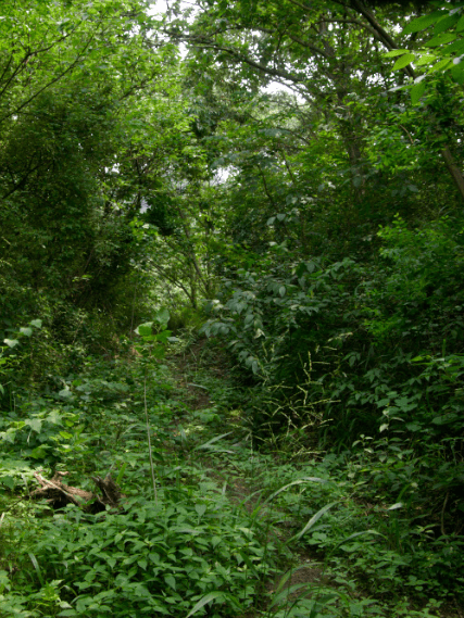 再向前,路果然被杂草树木摭拦,荆棘牵衣,飞虫迷眼,不斩荆披棘是不能过去的。一手荷锹,一手拿相机,再看阳光透过树枝,照在林里,忽明忽暗,寂静无声,仿佛有狼就在树后窥伺着我。