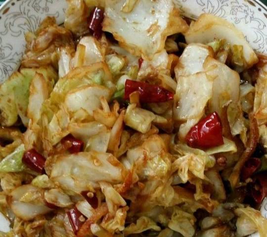 4、这道菜就叫不出名字来啦,用白菜和干辣椒爆炒。喜欢吃辣的朋友不可错过,是道极好的下饭菜。