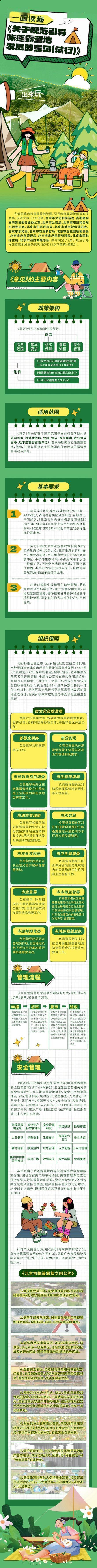 此次市级层面出台的《意见》分为正文和附件两部分。正文规定了北京帐篷露营地的适用范围、基本要求、组织保障、管理流程和安全管理等。明确了《意见》适用范围是本市行政区域内的旅游景区、旅游度假区、公园、酒店、乡村民宿、农业观光园等露营管理单位,在本场所内设立帐篷露营地,组织、开展以帐篷为主要休闲和住宿设施的露营经营活动及服务。