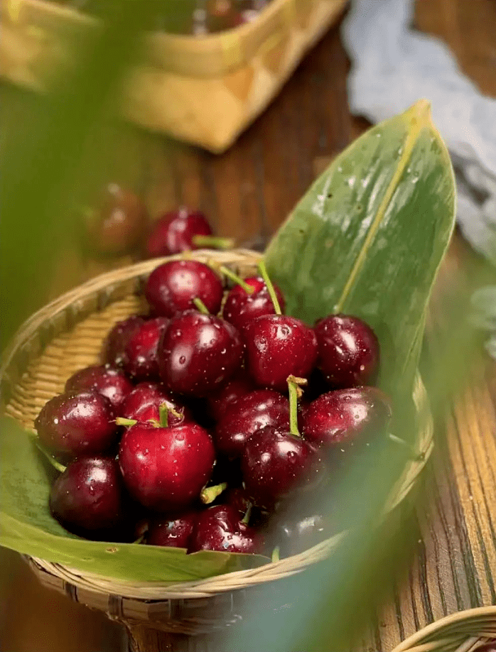 这里的甜樱桃品种多达30余种,加上常年受岷江河水的滋养,空气湿度足,昼夜温差大,个个都长得甜蜜诱人。
