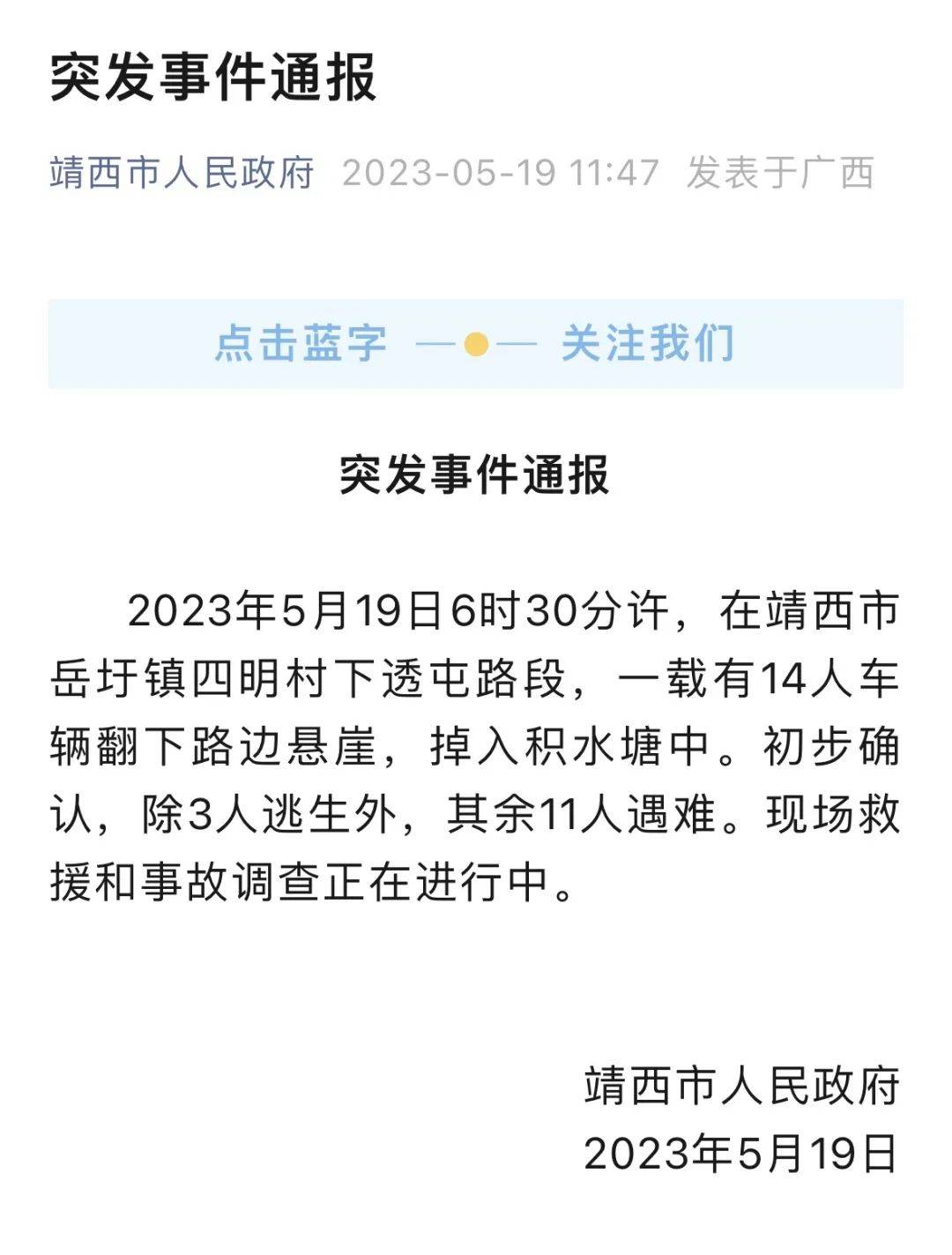 据广西百色靖西市人民政府微信公众号消息,2023年5月19日6时30分许,在靖西市岳圩镇四明村下透屯路段,一载有14人车辆翻下路边悬崖,掉入积水塘中。初步确认,除3人逃生外,其余11人遇难。现场救援和事故调查正在进行中。