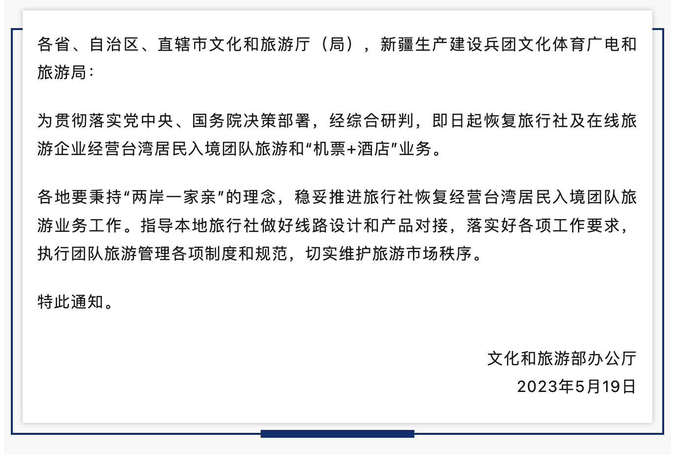 5月19日,文化和旅游部办公厅发布通知,即日起恢复旅行社及在线旅游企业经营台湾居民来大陆团队旅游和“机票+酒店”业务。