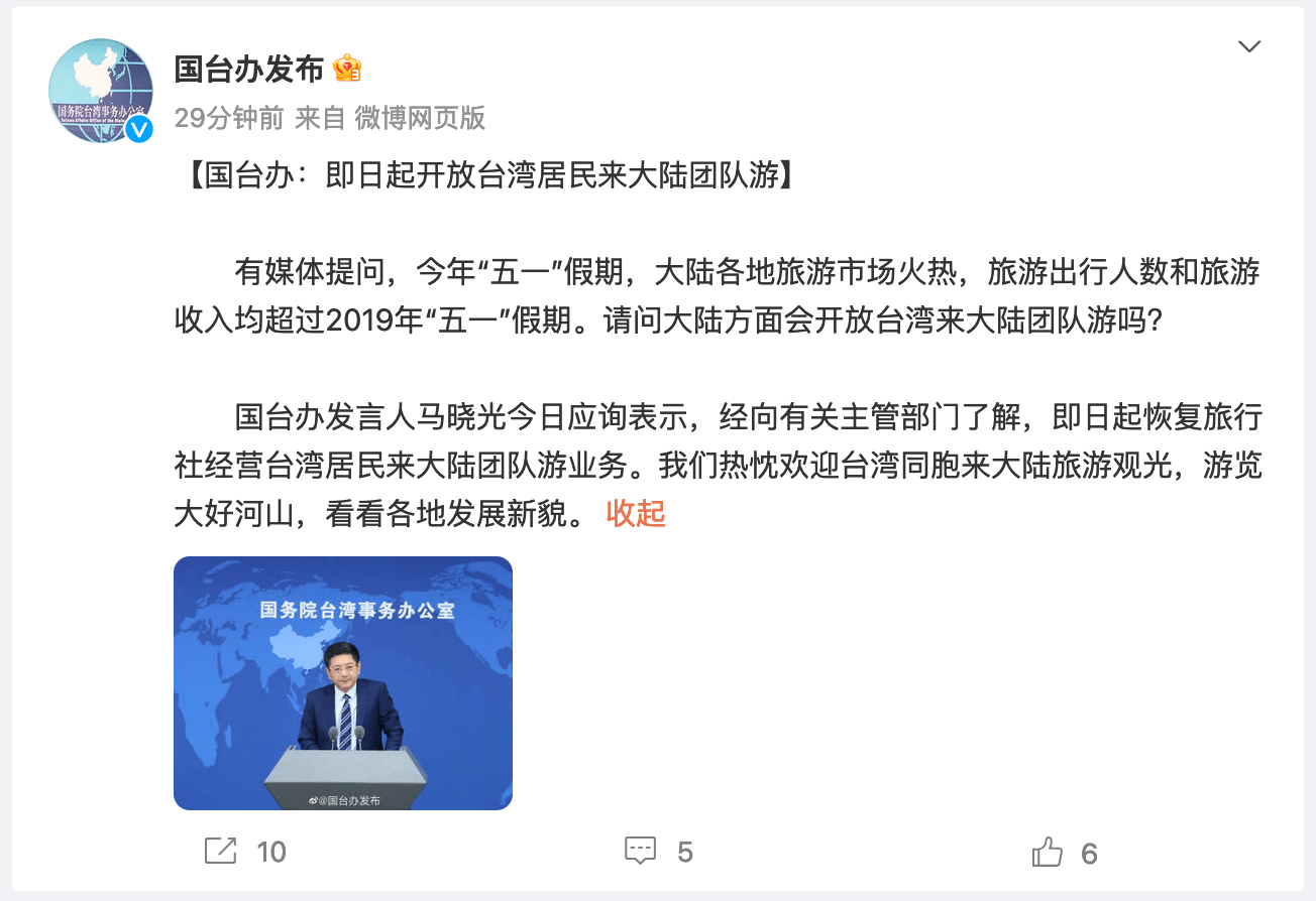 当日,据国台办发布官方微博消息,国台办发言人马晓光也表示,经向有关主管部门了解,即日起恢复旅行社经营台湾居民来大陆团队游业务。我们热忱欢迎台湾同胞来大陆旅游观光,游览大好河山,看看各地发展新貌。