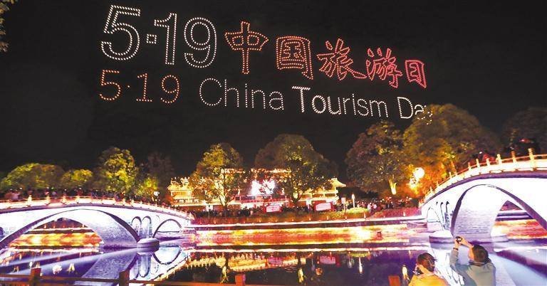 5月18日晚,云南省腾冲市三桥文化广场1500台无人机飞行表演秀出动态文字画面,吸引游客前来观看。龚祖金摄(中经视觉)