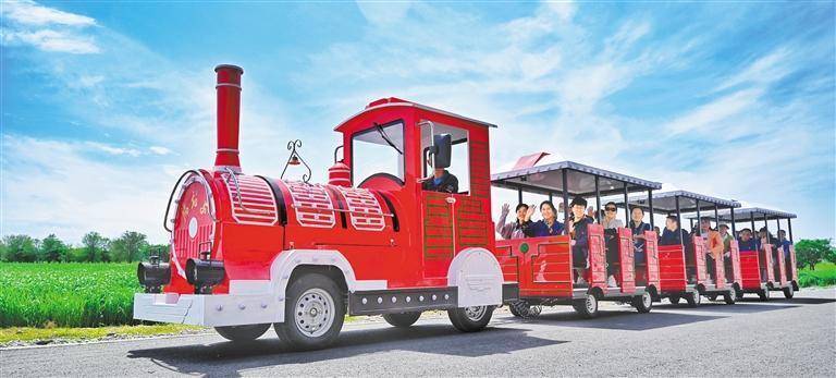 5月19日,游客乘旅游观光车在新疆昌吉回族自治州奇台县半截沟镇腰站子村游览。奇台县依托优质小麦种植基地发展特色乡村旅游,吸引众多游客前来游览。陶维明摄(中经视觉)