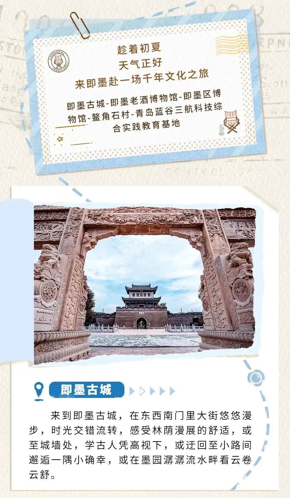 即墨区将即墨古城、即墨老酒博物馆等特色资源串点成线,策划推出了“人文溯源之旅”线路,让市民游客趁着初夏,天气正好,来即墨赴一场千年文化之旅。