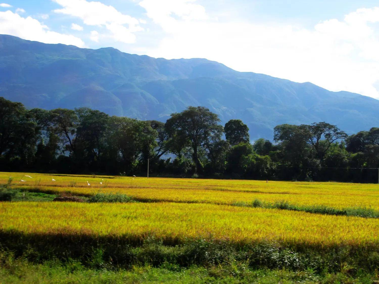 一个巧缘,知道大理剑川有个沙溪古镇,藏在深山的坝子里。这个崇山峻岭里的小坝子,使得翻山越岭走过崎岖山路的我们,忽然觉得就像置身世外桃源的感觉。蓝天白云间,是平坦金黄的麦田,干净古朴错落的村寨,偶尔还有些白色的芦苇在金黄的麦地里摇晃,不知名的紫色小花散落在田埂边,绿色环绕周围,冥想在如此色彩浓郁的空间飞翔,安静啊,不由得心生喜悦。