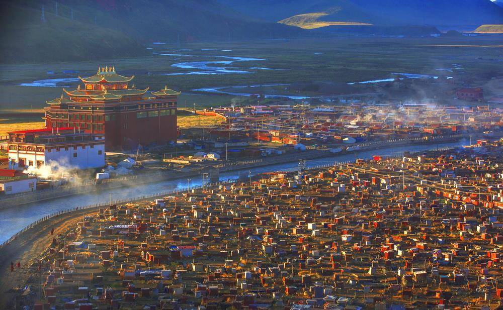 这里大概有一万多名女僧人在这里修行。这里的优美自然风光和和谐的生活状态,实在适合一些向往内心平和的人到这里小住。亚青寺四面环山,这里不存在什么规模浩大的寺庙,因为到这里修行的都是崇尚清修的比丘尼,比丘尼们会在这片山间草原上搭建自己的临时住所,就这么在简陋的住所里一住就是大半年。