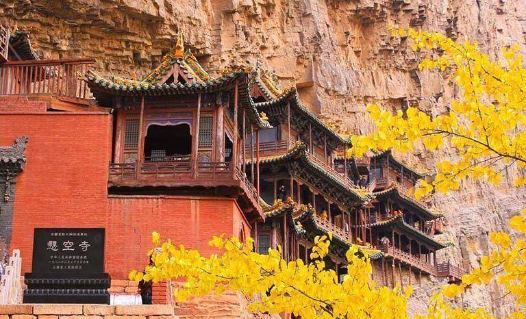 悬空寺(悬空寺)距地面近50米,建在悬崖峭壁上,是一座佛、道、儒三教并存的独特寺庙,距今 已有1500多年的历史。它是一座不同寻常的建筑,它完美地结合了力学、美学和宗教,展现了中国古代灿烂的文化、艺术和历史。