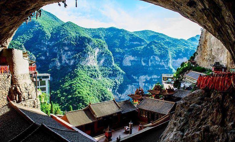 该寺位于大同市东南约65公里处。其上部为陡峭的石灰岩,下部为山谷,河水穿流而过。远远望去,悬空寺仿佛由数十根柱子支撑着。但登上石阶后,你一定会惊叹这座寺庙建筑群牢固而巧妙地镶嵌在悬崖之中。走过栈道,层层叠叠的40座古殿、亭台楼阁尽收眼底。