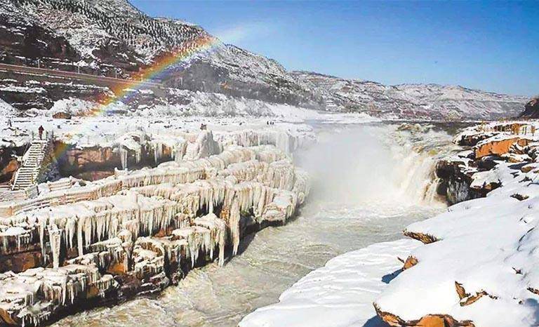 结冰的壶口瀑布与美丽的彩虹