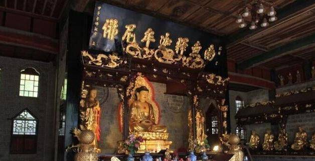 继续向上,则是“大雄宝殿”,其位于寺院的最高处,左是经堂,右是念经堂,整体在两米多高的堡坎上,堡坎上面还有很多石刻图案,但是大多因为年代久远,有些模糊不清了,大殿门前有四根圆柱,为青砖制成,其殿内正中供奉的是释迦摩尼佛,上面有一牌匾,上书“南无释迦牟尼佛”,这几个字是当年济公和尚来此云游的时候所书。