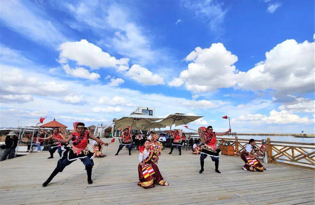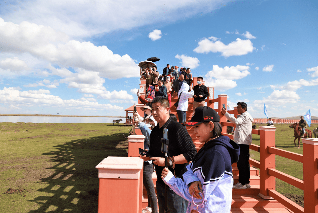 蓝天白云之下,在海拔3400多米的河曲马场景区上,悠扬的歌声婉转入耳,优美的舞蹈引人入胜,将现场游客时而带入“风吹草地现牛羊”的美丽草原,时而带入自然风光优美的河曲马场,现场骑手们策马扬鞭,上演草原上的速度与激情。观众呐喊助威、掌声雷动,热闹异常!