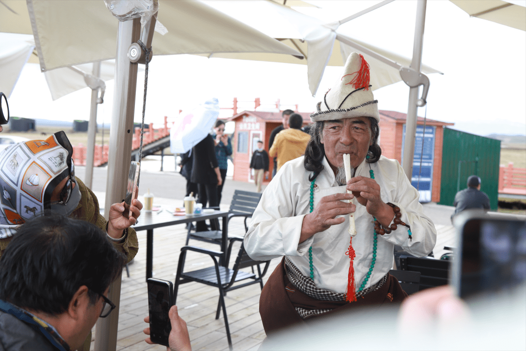 玛曲作为纯牧业生产和生活方式地区,许多古老的传统文化得以保留和继承,是藏族民歌弹唱的主要发祥地之一。玛曲被喻为藏族民间弹唱的艺术之乡,悠久的历史为弹唱的发展提供了丰富的内容和众多的曲调。在活动现场,节奏明快、旋律优美的民间弹唱,非物质文化遗产传承人进行鹰笛、牛角琴等技艺的展演,以歌传情,以曲达意,为游客带来了一场美妙的视听享受。