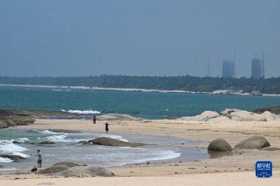 5月17日,游客在海南省文昌市淇水湾游玩,这里可以望见文昌航天发射场的发射塔架。
