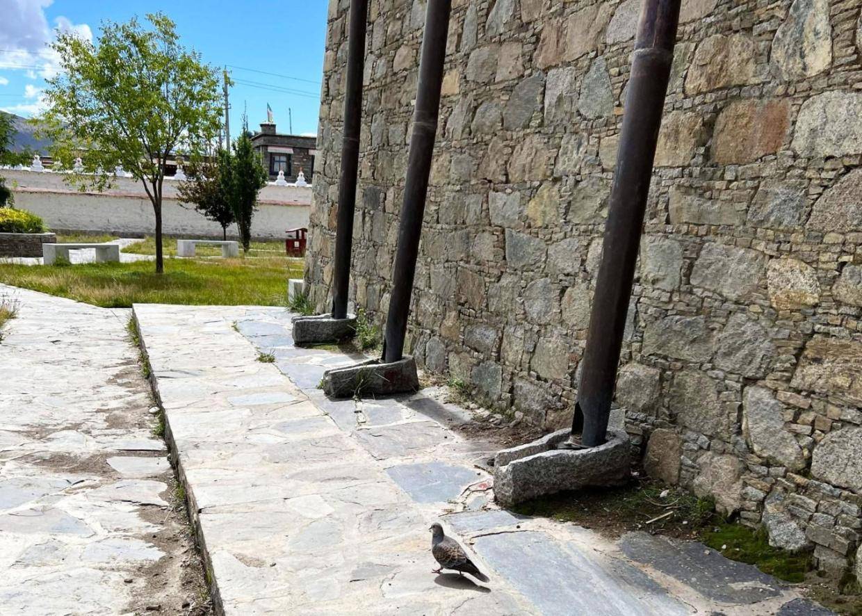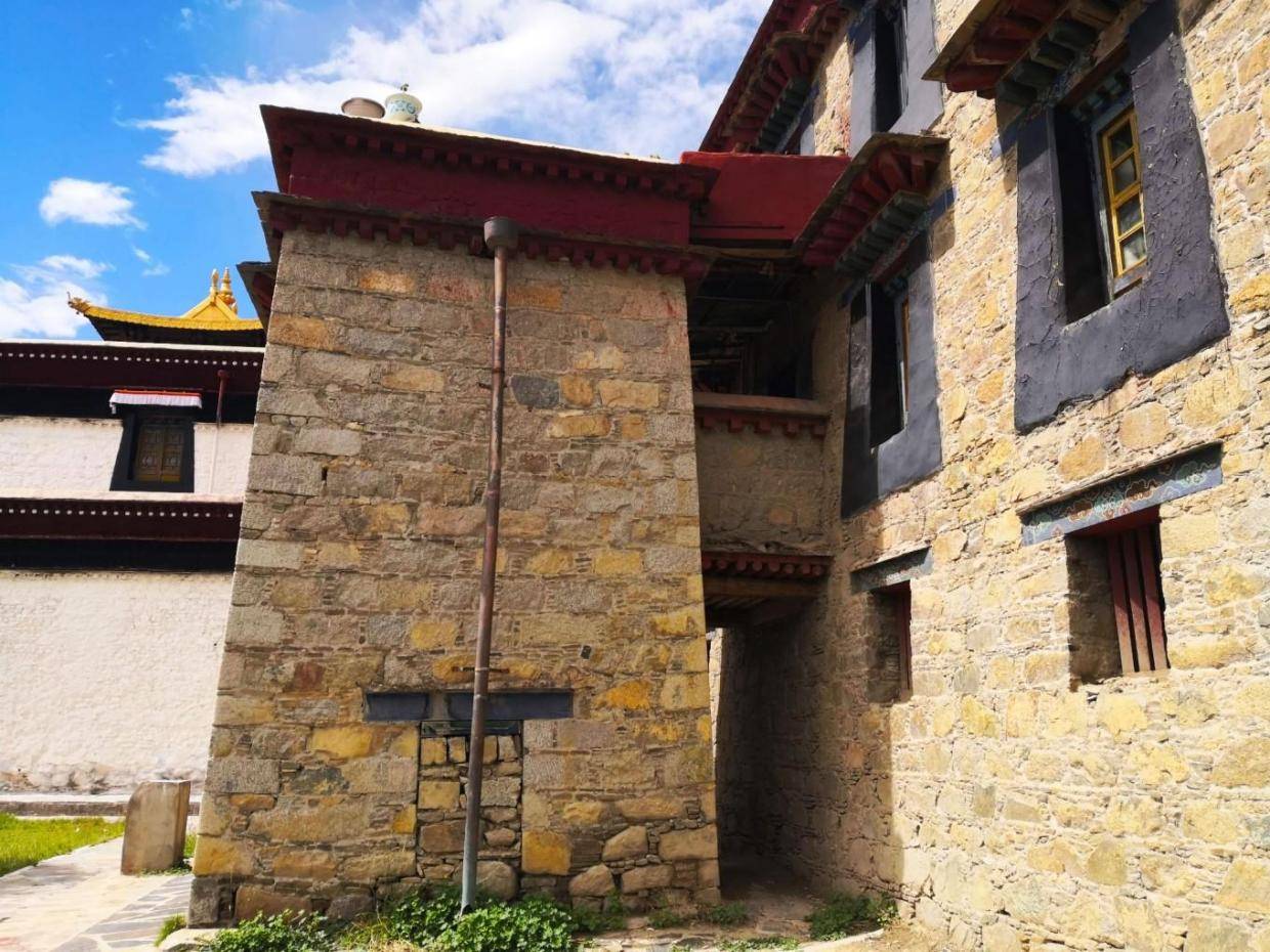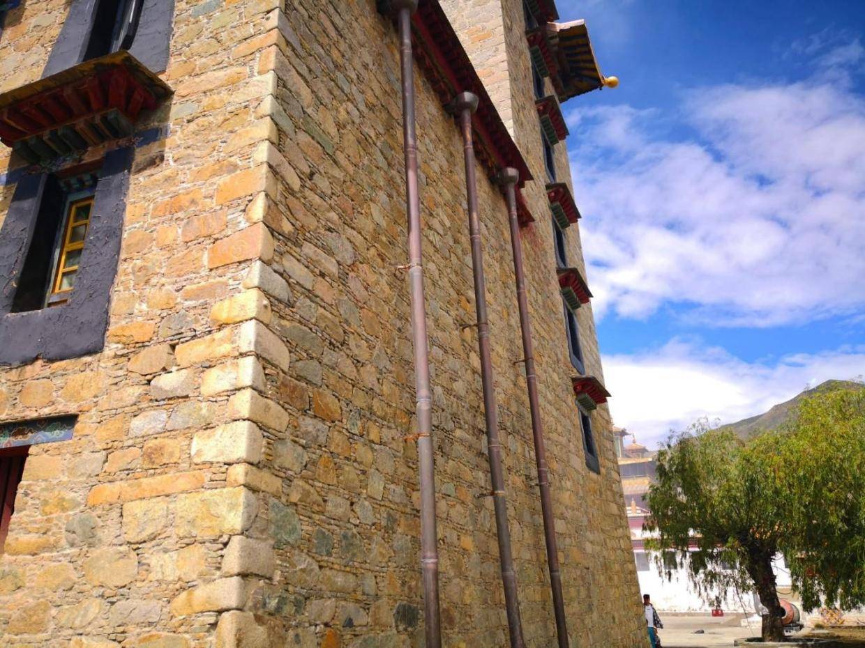 寺庙有很多石砌建筑应该是后期建设的,一样的高高藏式风格,只是外墙保持石头的本色没有涂白,有意思的是雨水管不是我们常见的PVC管材,感觉用的是铜质管材,不知道是不是这些寺庙的香火旺盛,东西都要用的与众不同。