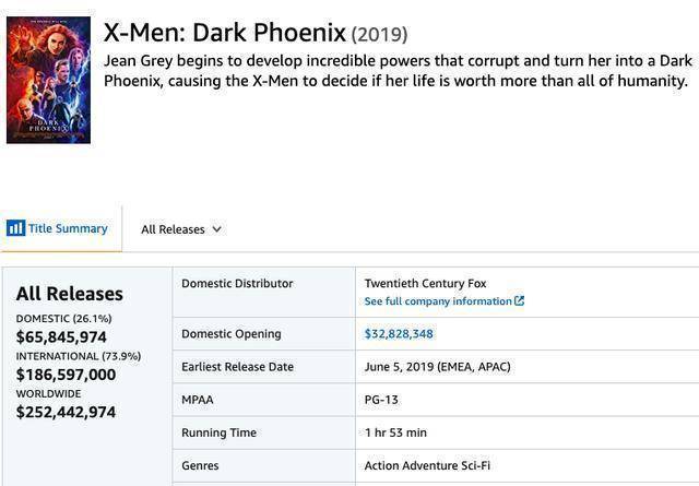 最终,北美地区只收了6500万美元,全球只收了2.52亿美元,还比不上20年前的上映的第一《X战警》票房(2.96亿美元)。