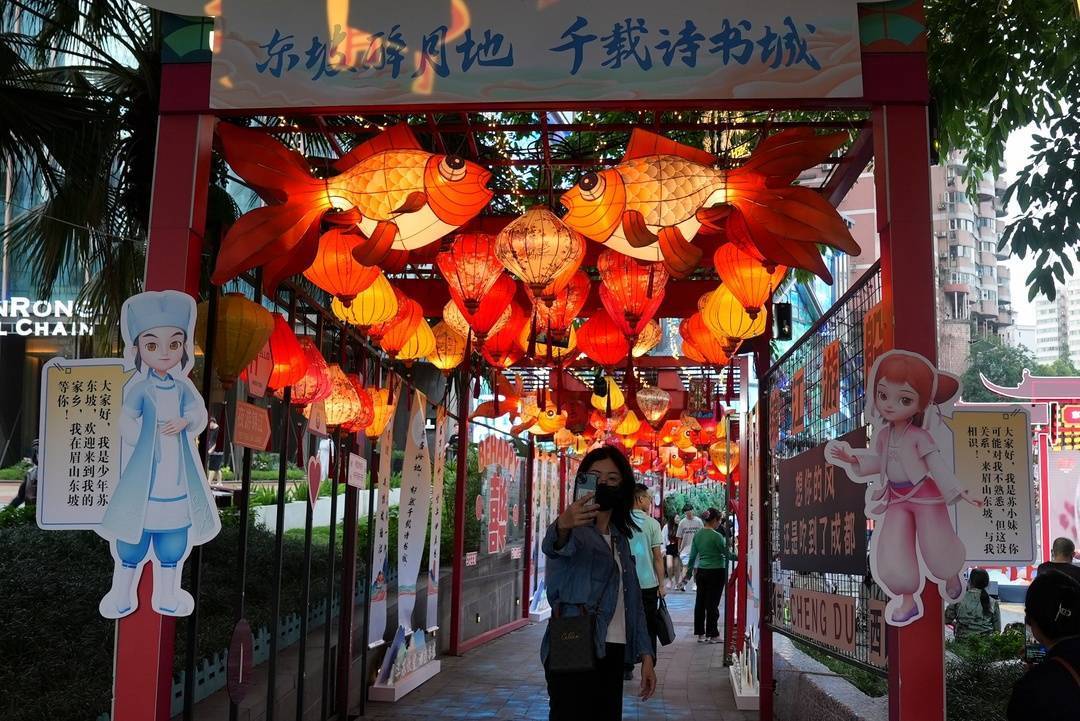 岸上推介精彩纷呈,水上体验更是新颖别致。游客们在身着汉服工作人员的带领下,穿过东坡文化长廊,前往码头乘坐游船。泛舟锦江的途中,四处都充斥着东坡元素。每艘游船的船身上带着东坡区或苏东坡有关的宣传语,方便水上岸上的游客观看。不仅如此,两岸河堤上的标语、岸边的凉亭上的东坡川剧、岸上建筑大银幕上播放着的宣传片,都无一不展现着东坡区文旅发展的魅力。