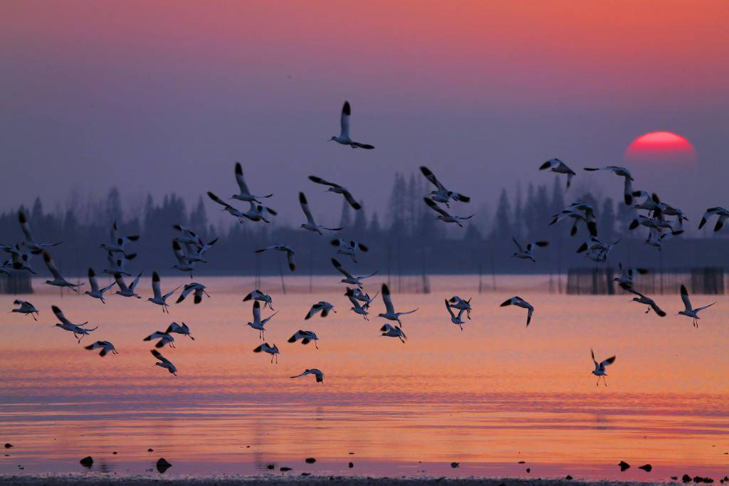 越冬候鸟振翅齐飞,完美诠释了“落霞与孤鹜齐飞,秋水共长天一色”的壮阔之景。彭斌/视觉中国