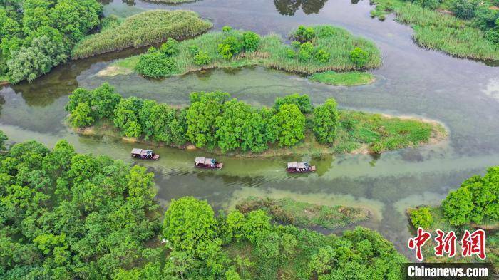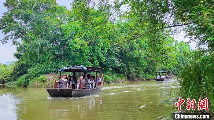 5月19日,在广西桂林市会仙喀斯特国家湿地公园,游客乘坐着木船穿梭在曲径通幽的会仙湿地,这里山清水秀、绿树成荫、碧波荡漾、鸟语花香,犹如一幅山水画,让游人流连忘返。会仙湿地被誉为“漓江之肾”,是漓江流域最大的喀斯特地貌原生态湿地。