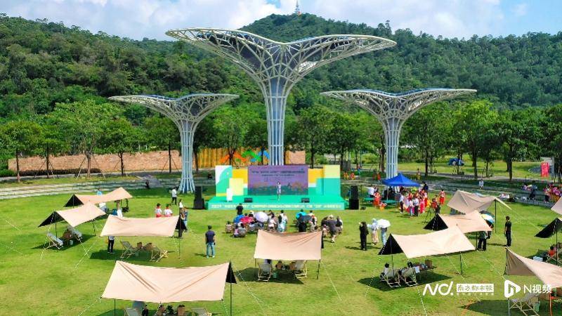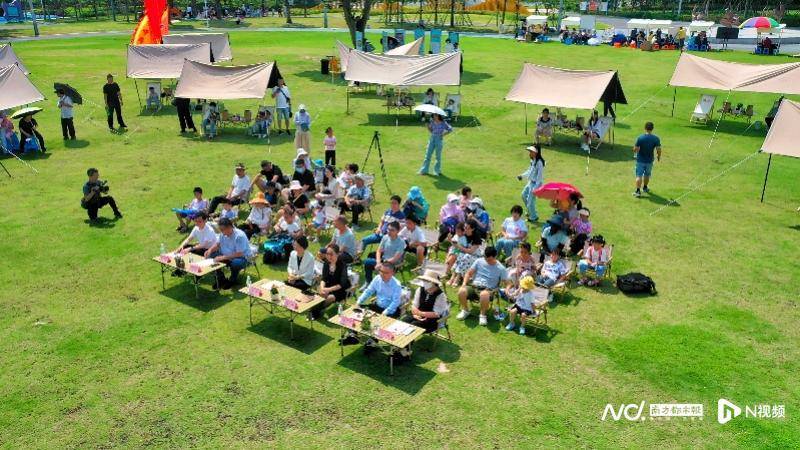 当天,面积为7000多平方米的斗门市民公园绿地上,散落布置着一顶顶天幕、帐篷,航拍下的照片里,犹如五颜六色的朵朵鲜花点缀着草地。
