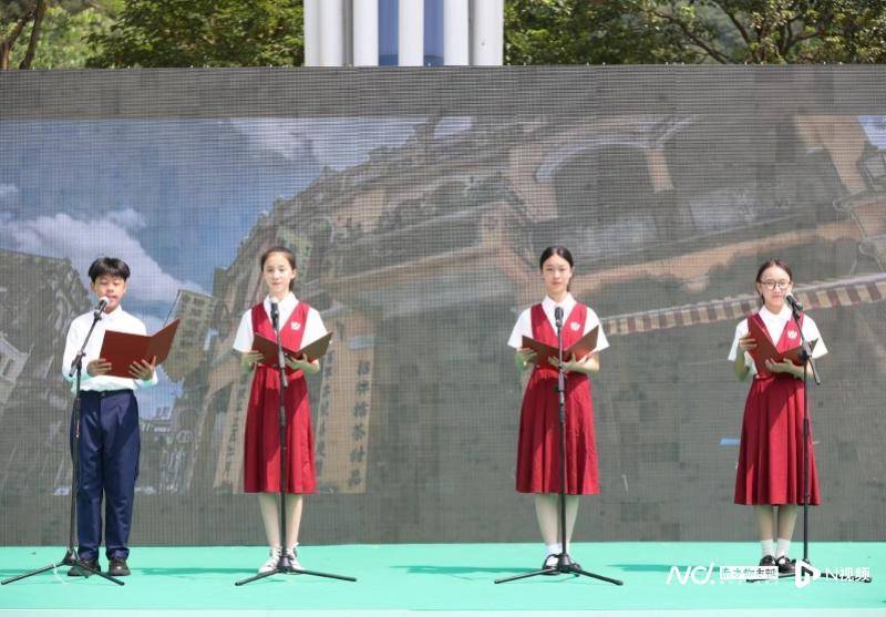 斗门区珠峰实验学校的4位同学,上台集体宣读《珠海市市民公约》。梁冠贤摄。