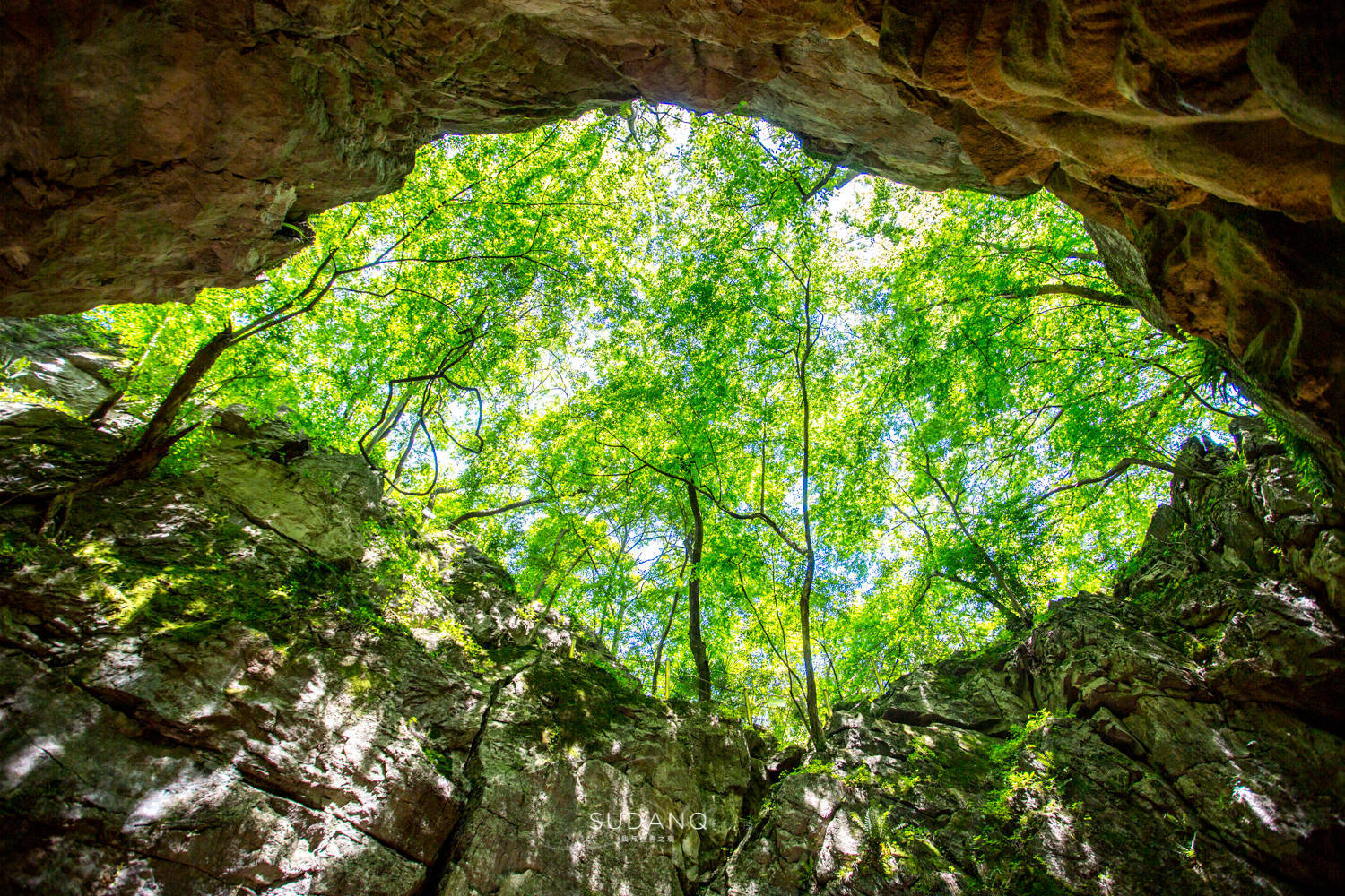 穿过前洞、中洞,抵达“天井”,忍不住发出赞叹之声——抬首,豁然开朗,青山叠翠,仿佛自己是置身在一个神秘的“天坑”之中。江夏县志》载称:“人进洞陈折半里,仰见天窦。”