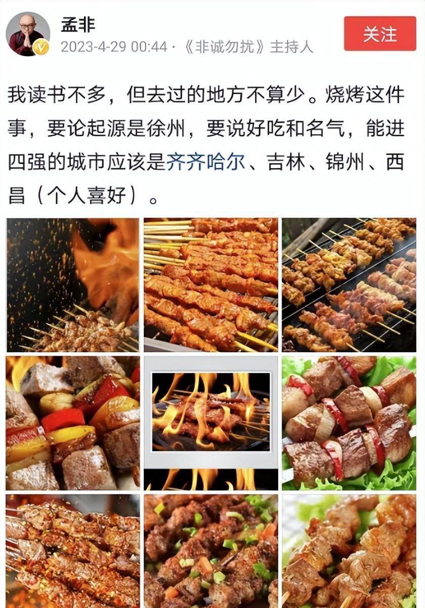 著名的主持人孟非在五一小长假发文表示,烧烤是起源于徐州的,论烧烤历史,显然淄博不能与徐总相提并论,同时孟非表示能进烧烤四强的城市分别是齐齐哈尔、吉林、锦州、西昌。