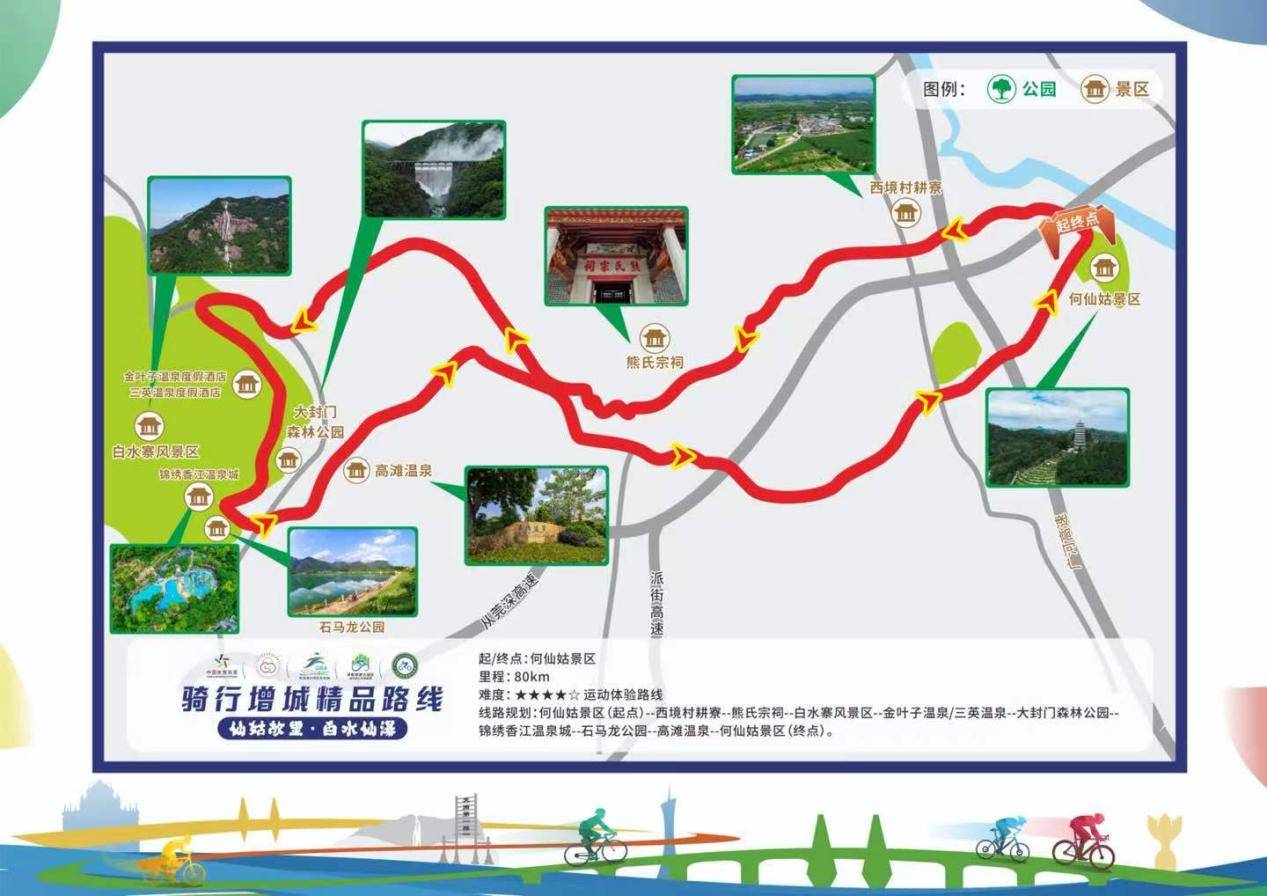 沿着树木郁葱的256省道,经高滩温泉回到何仙姑景区,结束80公里的骑行运动体验。