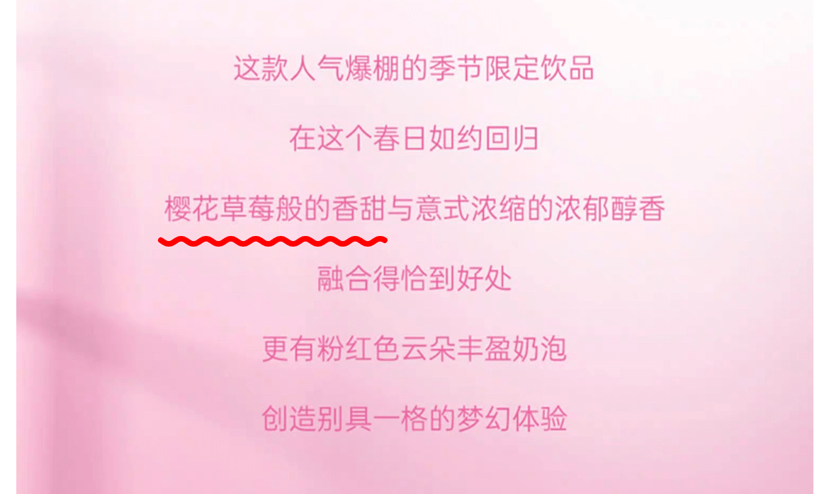 另一款“樱花风味咖啡”宣传具有“双重治愈香气——樱花的柔和,沁人心脾;草莓的香甜,鼻尖萦绕;两种芳香,美妙交织”;然而,产品配料表中同样没有任何与樱花相关的内容。