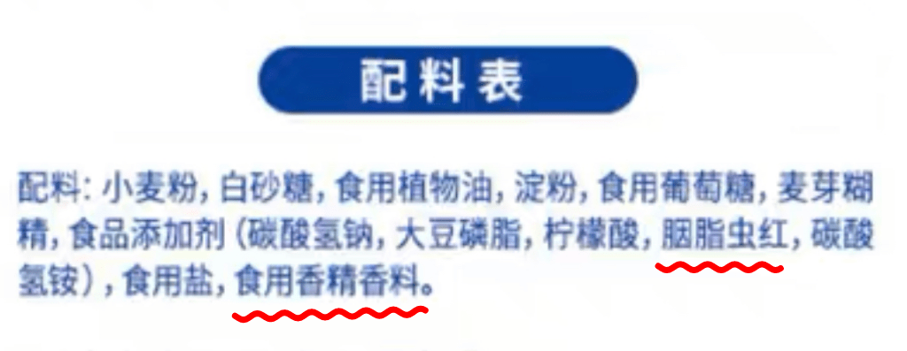 一款标称樱花风味的饼干,配料表中没有任何与樱花有关的成份,但有不少食品添加剂和食用香精香料。