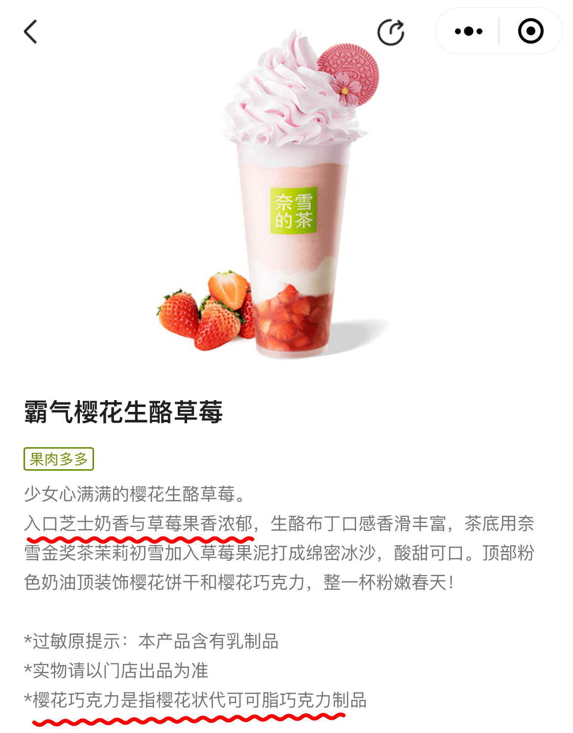 现制茶饮品牌“奈雪的茶”也推出了“霸气樱花生酪草莓”“樱花生酪拿铁”等季节饮品,在点单页面,特别标注了“樱花”的原料——粉色奶油、粉红色的饼干,以及樱花形状的代可可脂巧克力。