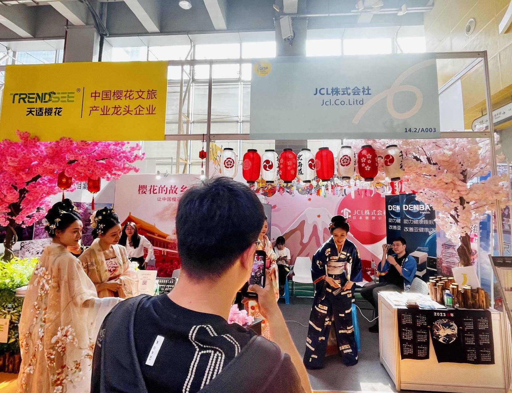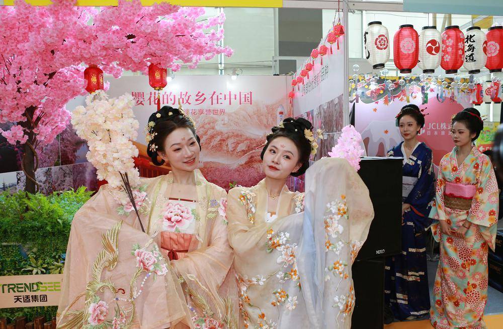 5月19日,正在广州中国进出口商品交易会展馆C区举办的2023广州国际旅游展上,观众有幸目睹了一场中日樱花的精彩“比拼”——中国樱花大王推广樱花新品种,巧遇日本旅游企业借樱花揽客,中国的粉色樱花和日本的白色樱花交相辉映,配合中日传统服饰的精彩演绎,展示了两国樱花各自的魅力。