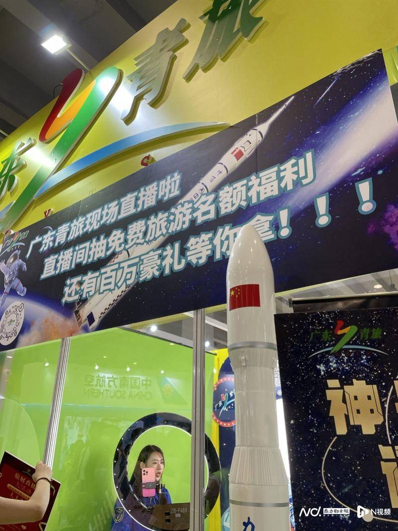 本次展会,广东青旅把航天主题直播间搬到了展馆现场,这是该旅行社与mcn机构合作,首创旅展直播间的形式,把主题性旅游线路产品通过线上、线下相结合的形式,将线上的流量引入到线下的旅行社,将线下的旅行社优秀产品和高质量服务通过线上传播。市民游客于旅展现场扫码即可参与抽奖,特等奖是价值6600元“观看神舟16号载人航天飞船发射”的线路。
