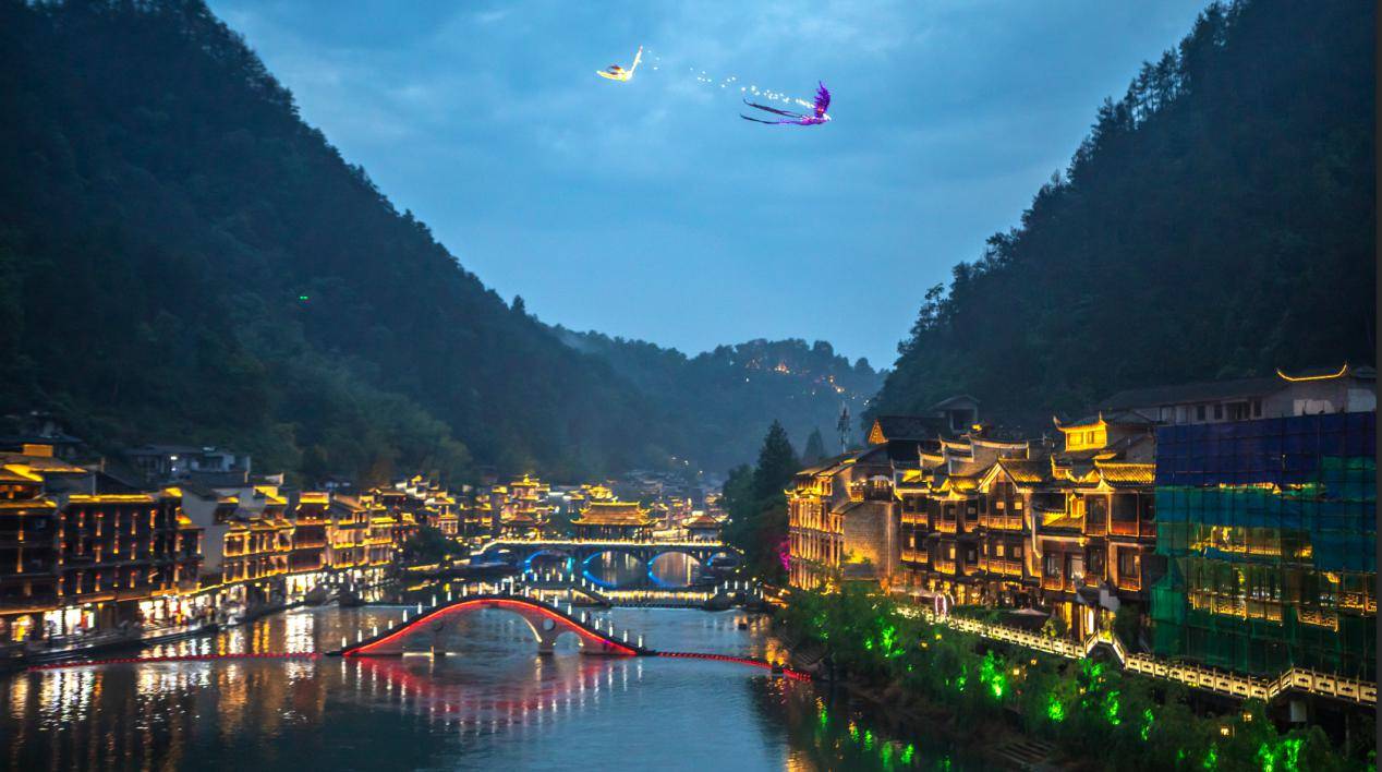 而此次的新闻发布会也很“不一样”,现场以凤凰夜游、旅拍产品作为体验项目,生动展示了“夜凤凰”的迷人魅力。百位身着特色民族盛装的姑娘们手持发光灯笼,沿着沱江边巡游,最终汇集云桥。而后,巨型“凤凰”现身云桥上空,伴随着婉转柔长的琴音,唤醒了凤凰这座古今交融的梦想之城——长波若泻,两岸灯光璀璨,繁楼灿若群星......古城灯光逐步点亮,“凤凰”的身影穿梭其中,山、水、城交相辉映,让到场嘉宾与游客纷纷沉醉。同时,发布会还以线上方式,在凤凰古城夜景上空通过视频展现“百鸟朝凤”的场景,让无数网友为之震撼。