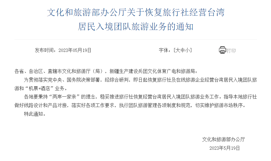 5月19日,文化和旅游部办公厅发布关于恢复旅行社经营台湾居民入境团队旅游业务的通知,通知提出,为贯彻落实党中央、国务院决策部署,经综合研判,即日起恢复旅行社及在线旅游企业经营台湾居民入境团队旅游和“机票+酒店”业务。