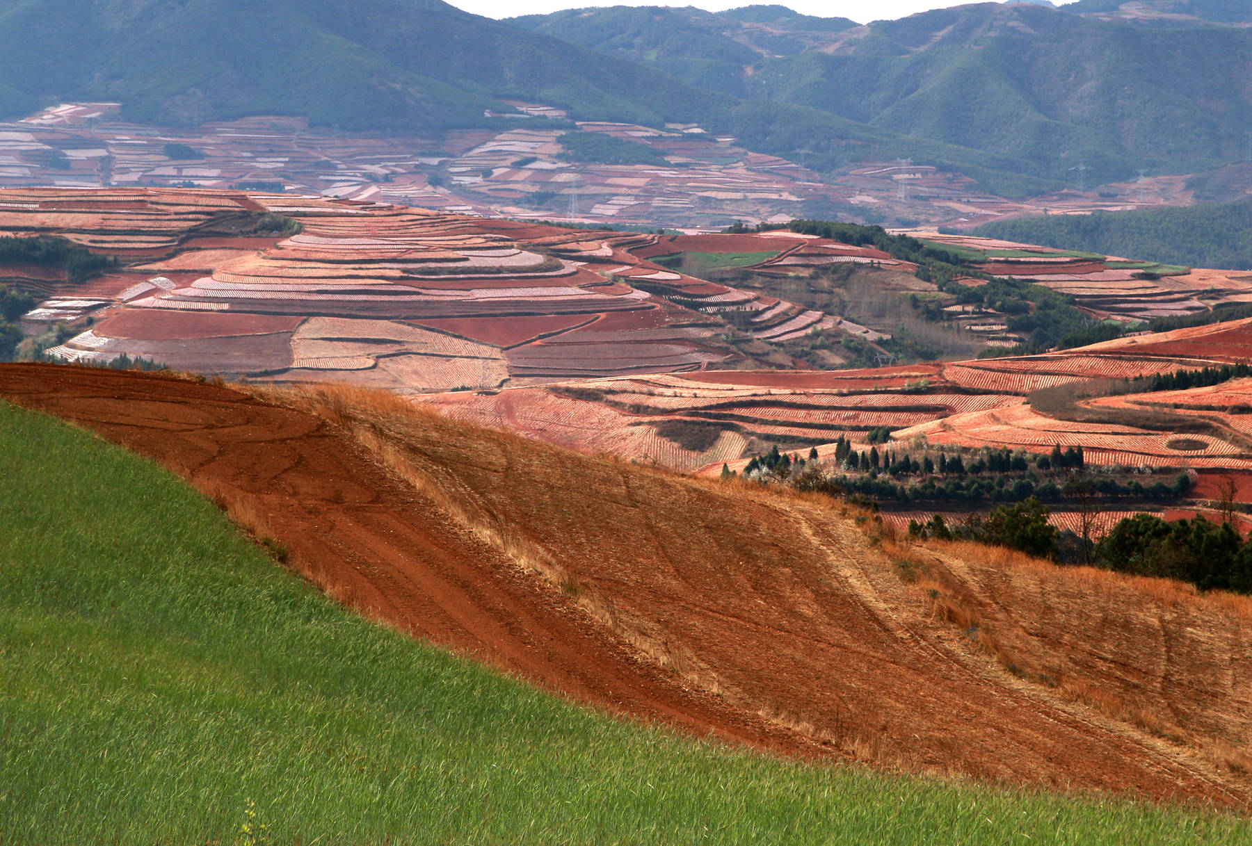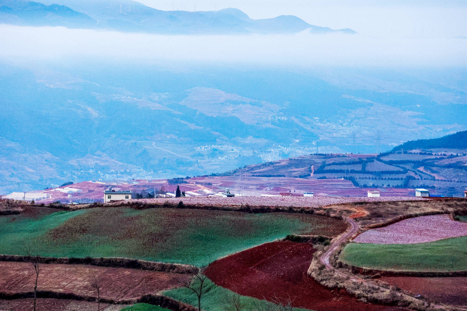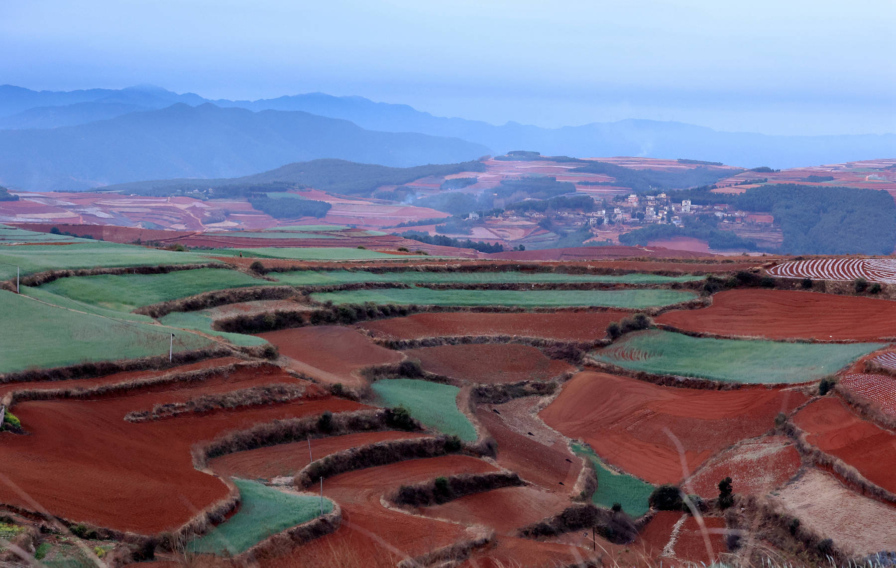 红是它的主色调,是它的底色。春天的东川红土地又不仅仅是红,还有绿有灰,有青有黄,有蓝有紫,有浓有淡,那种丰富绚烂的色彩,有人把她比喻为上帝的调色盘。可我感到这种比喻又太多太烂,据查国内有很多景区被游客轻易的誉为上帝的调色盘。我还是想用评判中国古典诗词的评语:现在东川红土地景区呈现出来的是一种豪放,是一种恢弘,是一种亢奋式的铿锵,是一种意境雄浑式的高远,兼具一种隽永式的旷达。