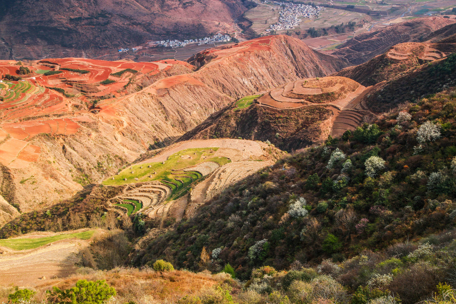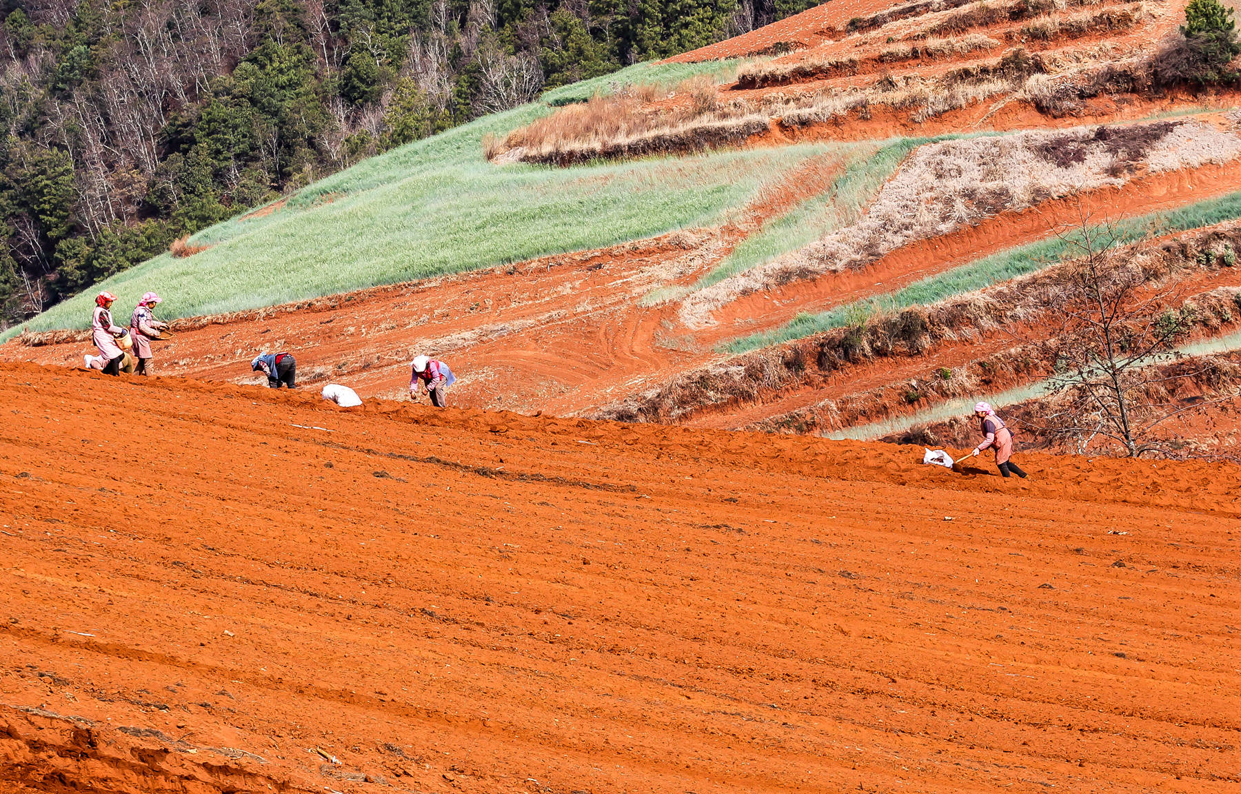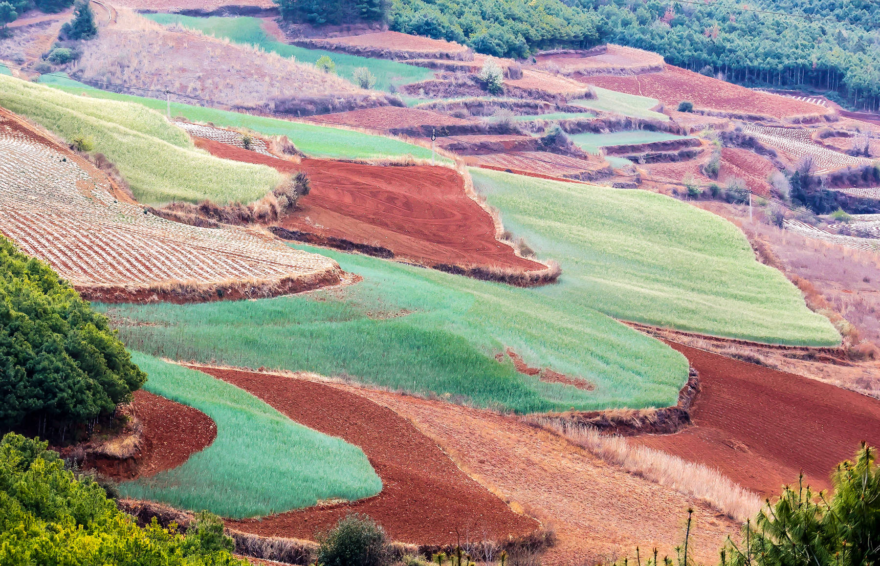 红是它的主色调,是它的底色。春天的东川红土地又不仅仅是红,还有绿有灰,有青有黄,有蓝有紫,有浓有淡,那种丰富绚烂的色彩,有人把她比喻为上帝的调色盘。可我感到这种比喻又太多太烂,据查国内有很多景区被游客轻易的誉为上帝的调色盘。我还是想用评判中国古典诗词的评语:现在东川红土地景区呈现出来的是一种豪放,是一种恢弘,是一种亢奋式的铿锵,是一种意境雄浑式的高远,兼具一种隽永式的旷达。