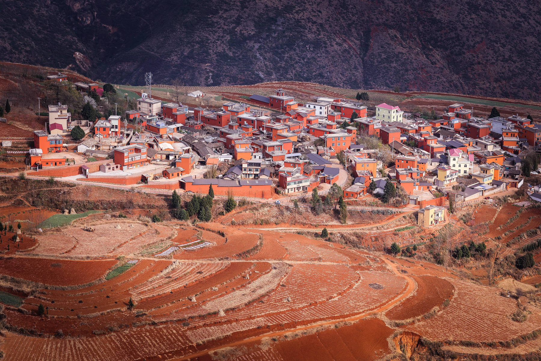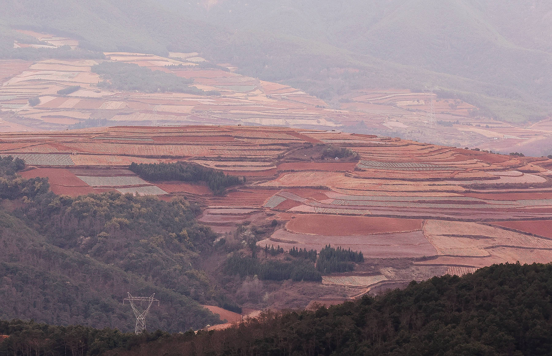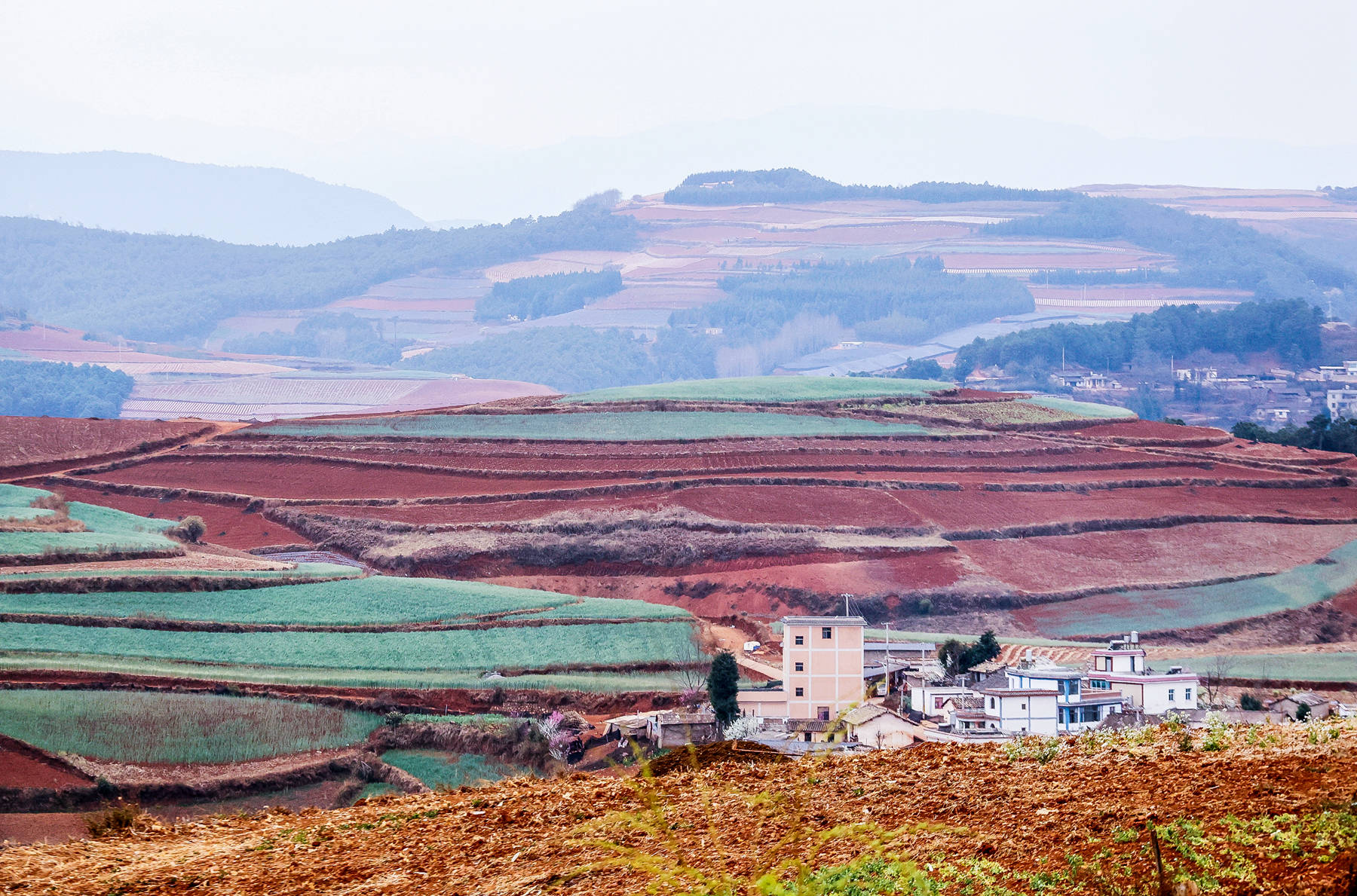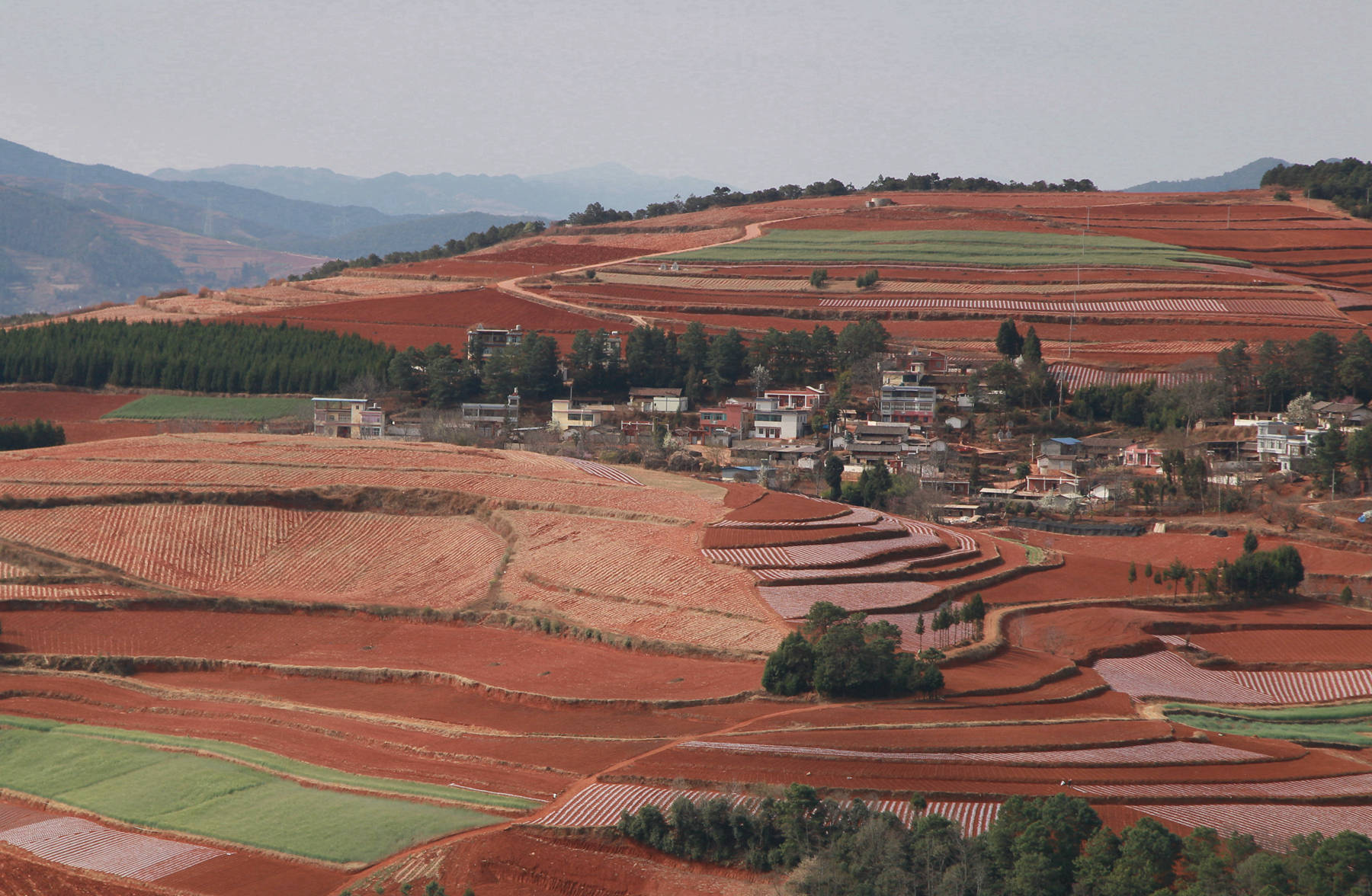 因缘际会,今年3月又去了一次东川红土地。现在的东川红土地已今非昔比,村落多了,旅馆多了,交通方便了。景区内,那经过规整的一片一片红,一坡一坡红,一山一山红,簇拥着奔涌而来,有一种浩瀚雄伟的气魄,有一种脱胎换骨、意气风发的气势。