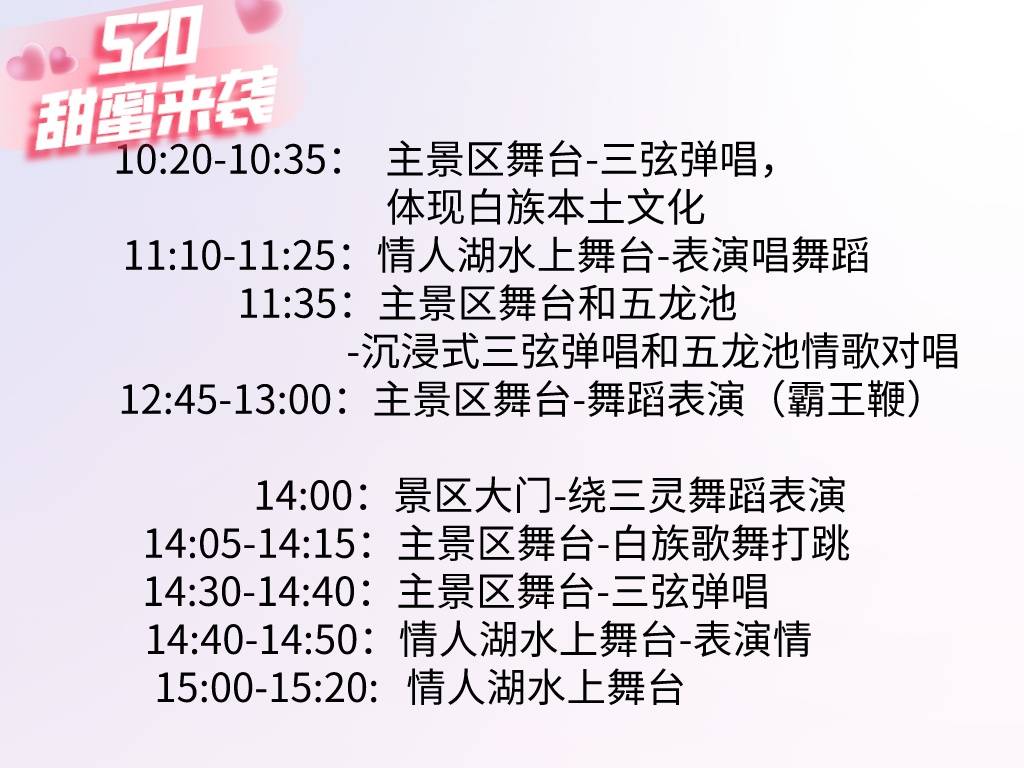 这个演出节目表包括舞蹈、歌唱和音乐表演,体现了大理的本土文化。节目安排在不同的场地,包括主景区舞台、情人湖水上舞台、景区大门等,观众可以在这些不同的场地观看不同的表演。但请注意,演出时间可能会因天气或景区安排而有所改变,最终安排以景区通知为准。