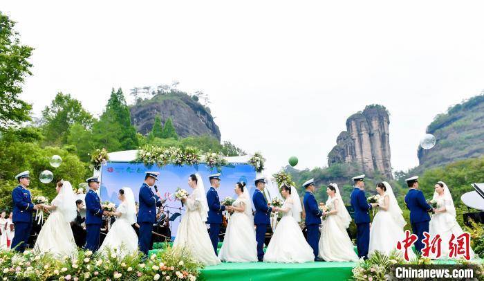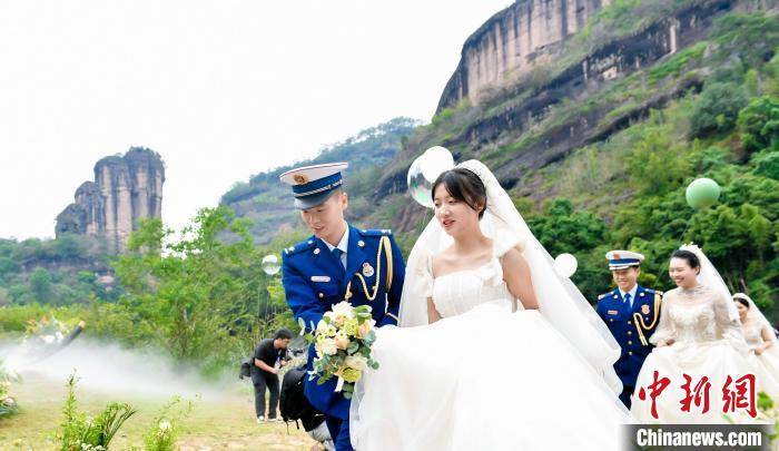 当天,玉女峰下,来自武夷山消防大队的8位“国家公园守护人”举办集体婚礼,在队员和嘉宾见证下,八对新人一起许下幸福的承诺,新娘洁白婚纱映衬着“火焰蓝”,交织出独特的浪漫氛围。金婚夫妇代表现场分享爱情故事。