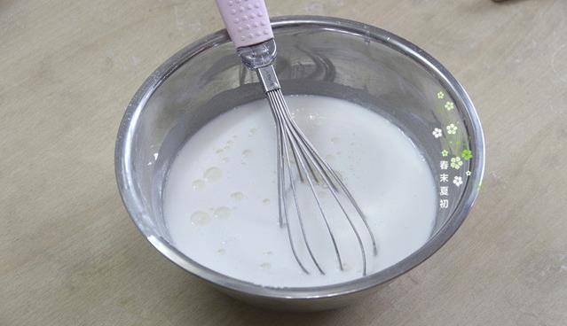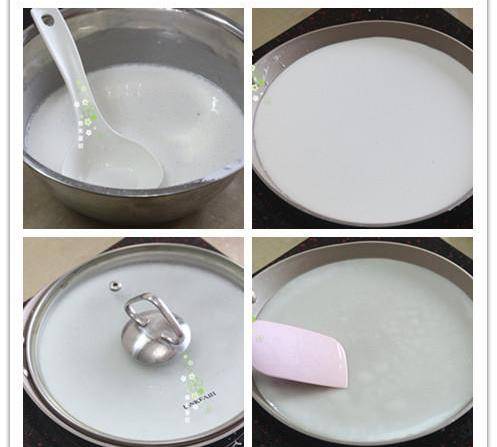 2、用电饭锅的粥勺舀取面糊,大约一勺或者多一点的分量都可以,每次舀取都要搅拌面糊防止沉淀;平底锅预热好,另一只手就可以把平底锅拿起,快速在中间倒入面糊,同时快速晃动平底锅让面糊快速布满整个平底锅里,摊平摊开再放电陶炉上,盖上盖子,最小火煎20秒左右,时间不是一定的,火力不同,要看粉浆成形、表面凝固的时间为准,最后抹上薄薄一层葵花籽油防止干裂,继续盖盖煎一会。