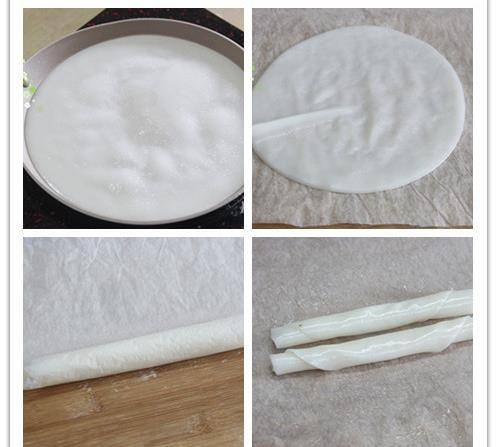 3、要小心看着等粉皮与锅底分离、鼓起时,就可以把锅移离火源,把粉皮倒扣在硅油纸上,让它自然脱落在硅油纸上面,这时趁热把硅油纸卷一卷,让粉皮放凉一会,不烫手时,快速从上往下卷成一卷;继续操作以上的步骤,把所有粉浆煎成一片片的粉皮。