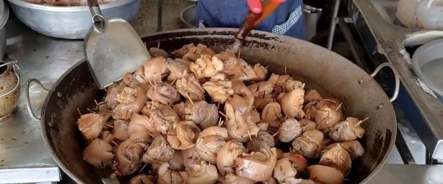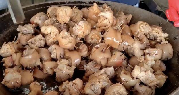 由于长时间烧卤,肉质容易松散,需要特殊的串煎技法,利用猪皮本身的脂肪,采用延展包复式的方式,用两根竹签直接把它穿过去,形成四个固定点,这样再翻角的时候肉都不会分开,外形才会漂亮。