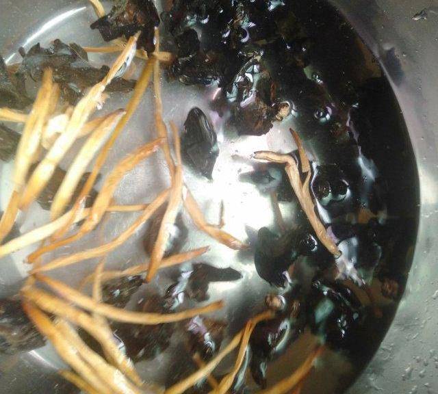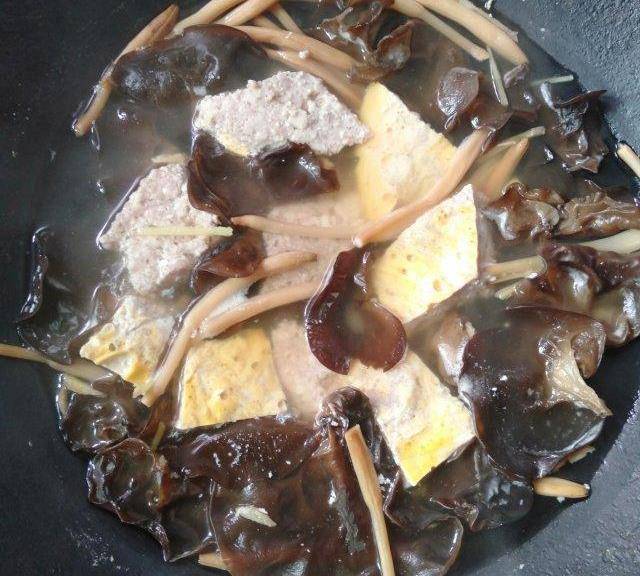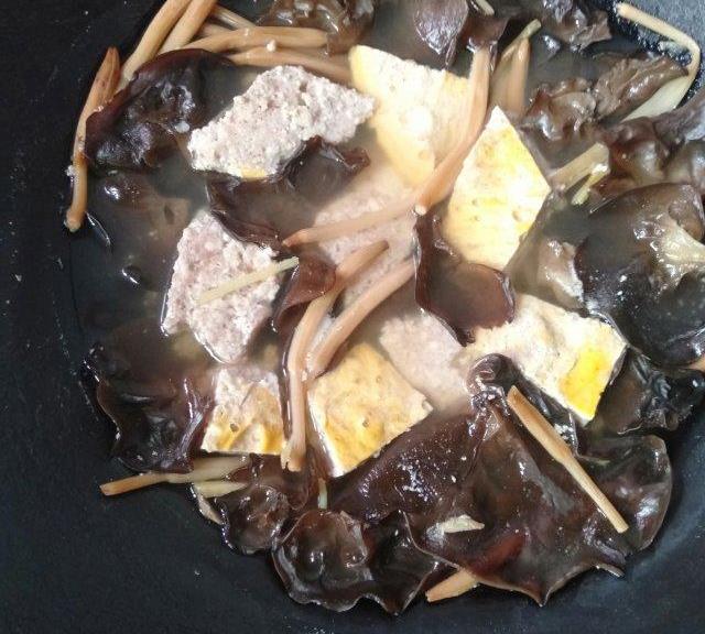 第10步、锅里放鸡汤,放木耳和黄花,切好的肉块。