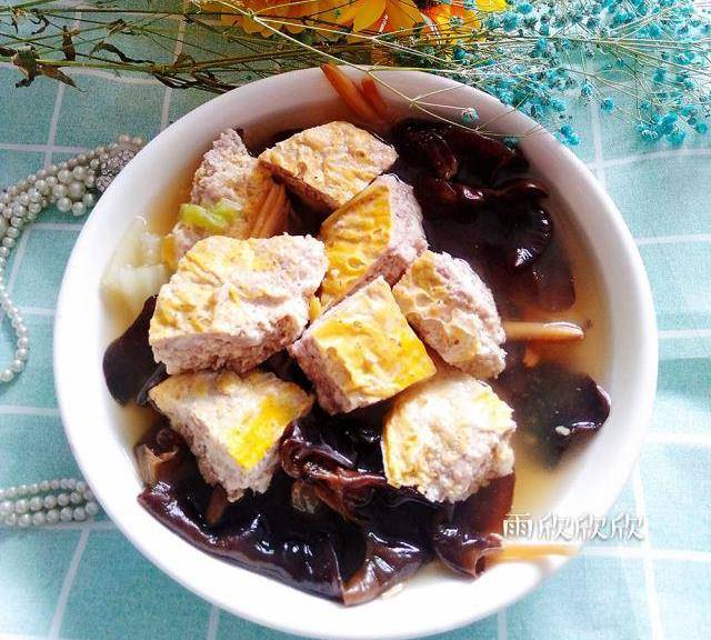 原料:猪肉、老豆腐、葱、鸡蛋、干黄花菜、干木耳、小白菜、鸡汤、姜、蒜、盐、花椒面、白糖、五香粉、酱油、色拉油。