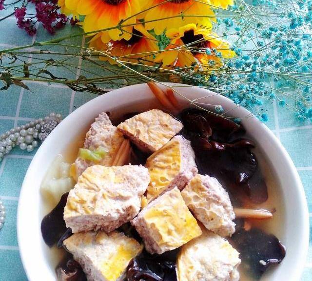传统的里面要加和猪心肺来熬制的汤。这道菜那个里面加的是鸡汤,感觉口感更加清淡一点。这个可以一次多做一点密封进冰箱,第二次拿出来直接煮就行。