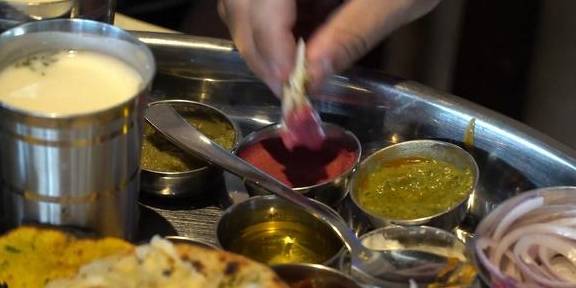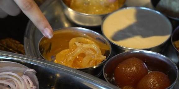 光是这烤的喷香的大饼,让人看了就非常有食欲了。里面不仅配有各类咖喱菜,而且还有新鲜的切成片的黄瓜、切成丝的洋葱、切成块的胡萝卜、磨成泥的水果……