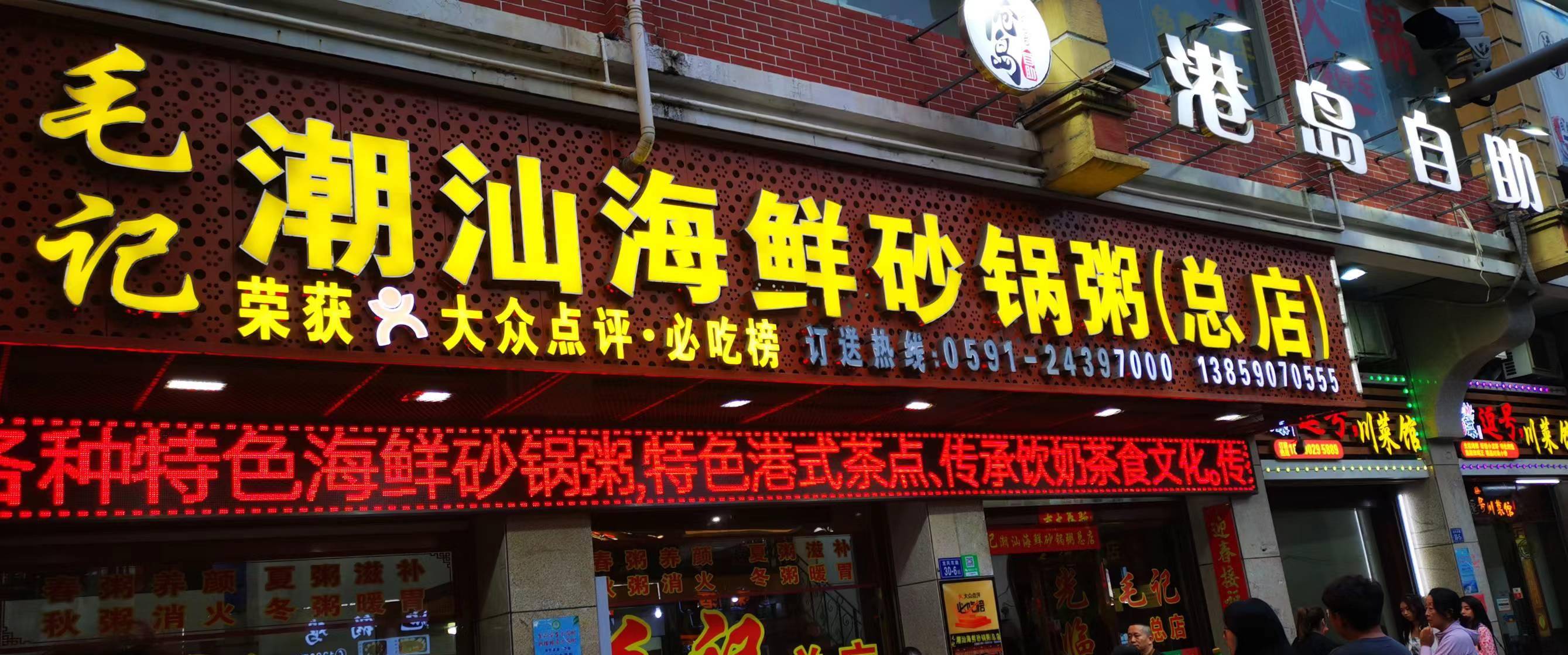 最有意思的是潮汕沙锅海鲜粥屋了。一条街道上仅隔两个门店的两家粥屋一个叫毛记潮汕沙锅海鲜粥总店,一个则叫毛记潮汕沙锅海鲜粥老店。总店的这家粥屋似乎要比老店的那边生意要好些。每天到了晚饭饭点,这家粥屋就排满了前来喝粥的食客;不太大的空间里顶多容得下30几张桌子,一到晚上六点,则必须要在粥屋的外边加桌;而另外一条街上一家潮汕海鲜粥馆也打起了“毛记”的招牌,只不过是叫“小毛记潮汕沙锅海鲜粥”。