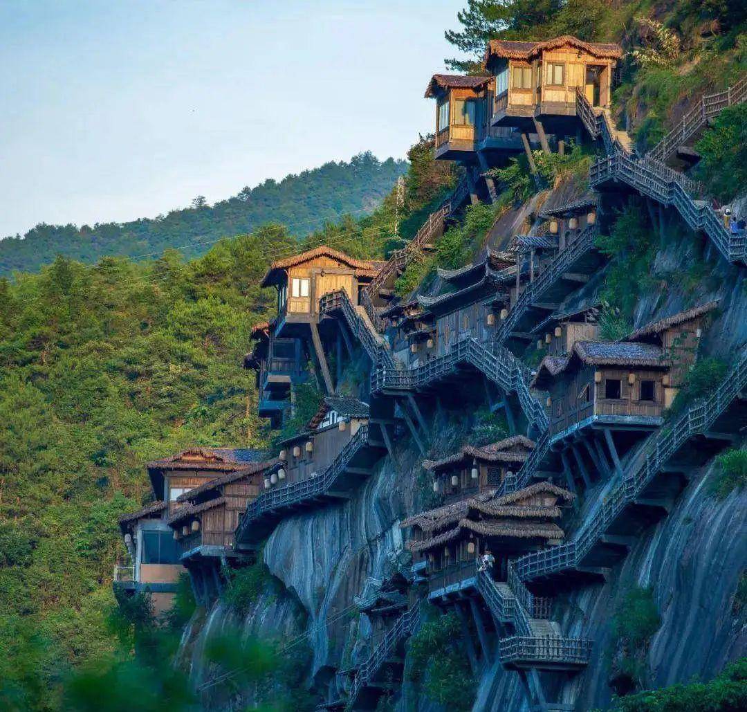 此外,望仙谷也打造了系列网红打卡地,例如磁百舸桥、望仙瀑布以及悬崖民宿,其中悬崖民宿依山而建,与水相邻,全景360度无限观景,可谓“举手可摘星河月”。